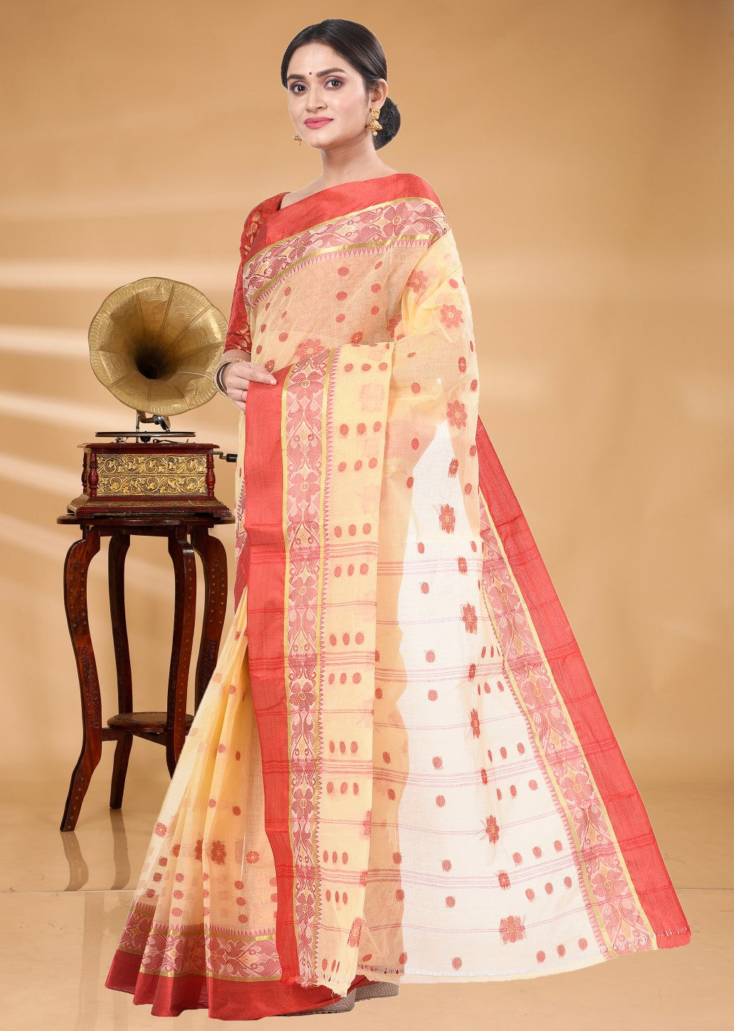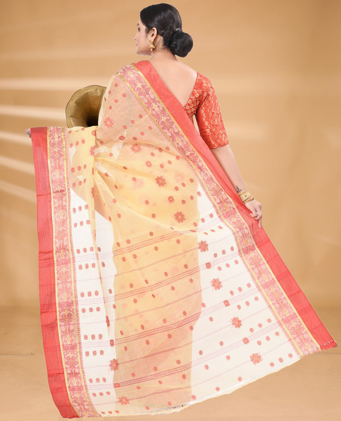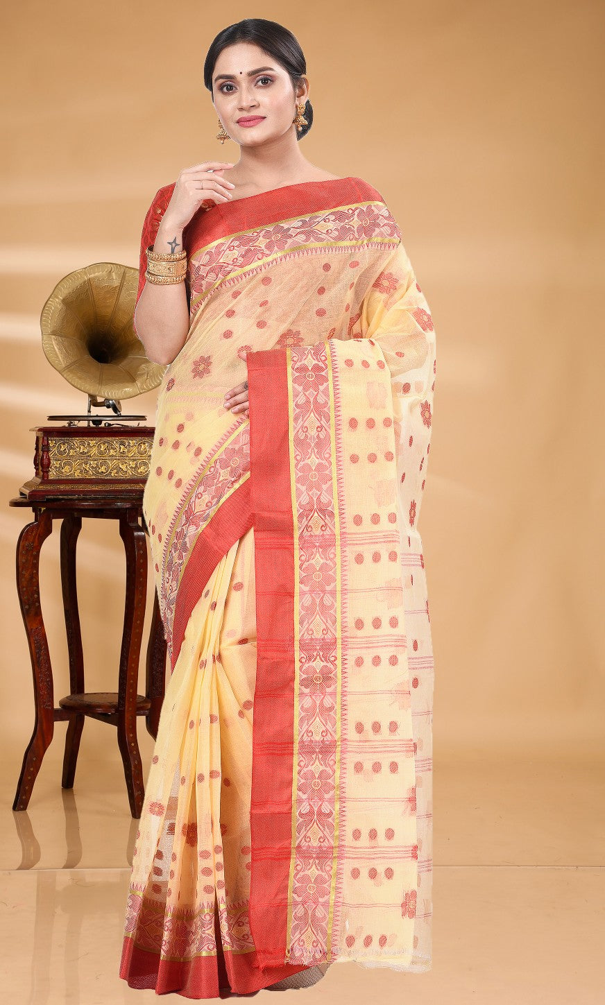 Tant sarees are light, airy, and perfect for everyday wear in warm weather. Our Printed Tant sarees add vibrant motifs and modern prints on the traditional Tant weave, offering a fresh, stylish twist while keeping the same comfort.